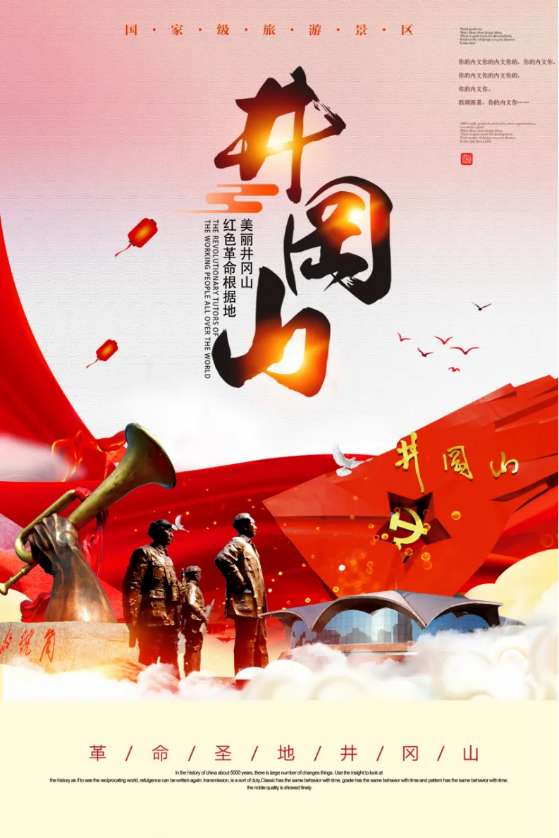 后车赴井冈山,游览井冈山标志性建筑【红旗雕塑】,高高飘扬的红旗中间镶嵌五角星、镰刀斧头和“井冈山”三字,熠熠生辉,光彩夺目。雄伟壮美的“井冈红旗”大型雕塑有三层寓意。一是它像一块屹立不倒的巨石,象征中华人民共和国在井冈山奠基;二是它像一团熊熊燃烧的火焰,寓意中国革命的星星之火从井冈山燎原;外观【胜利的号角】该雕塑以红军军号为主体,雕塑高8.1米,基座宽10.27米,寓意了1927年8月1日中国共产党发动南昌起义,打响武装反抗国民党反动派的第一枪。