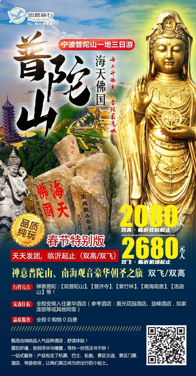 临沂飞宁波天天发团,飞机2680/人起,高铁2080/人临沂起止~真纯玩一价全含不进购物店,小交通小门票往返快艇全包含~虔诚祈福,得偿所愿!临沂人真正的旅游,欢迎喜欢旅游的人咨询报名。